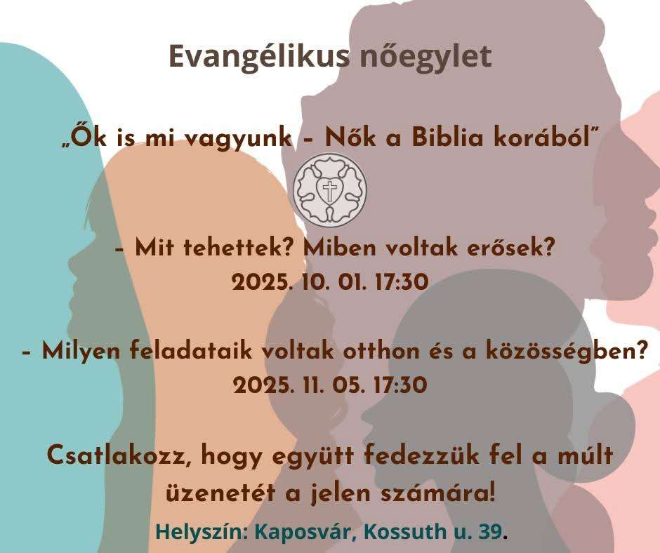 Evangélikus Nőegylet eseménysorozat! ✨Ők is mi vagyunk – Nők a Biblia korából ✨ Szeretettel hívunk minden érdeklődőt két különleges alkalomra,…